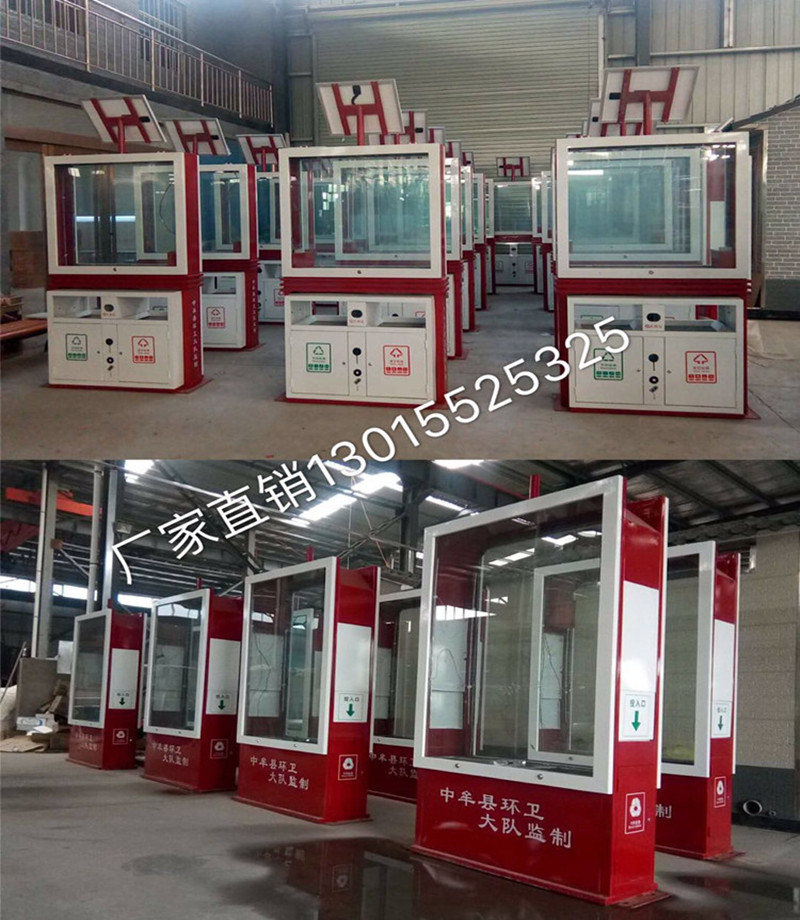 廣告果皮箱部分材料: 國標熱鍍鋅板1.2mm 鋼化玻璃5mm、6mm(常規為5mm) 燈箱外表處理180度高溫靜電噴塑